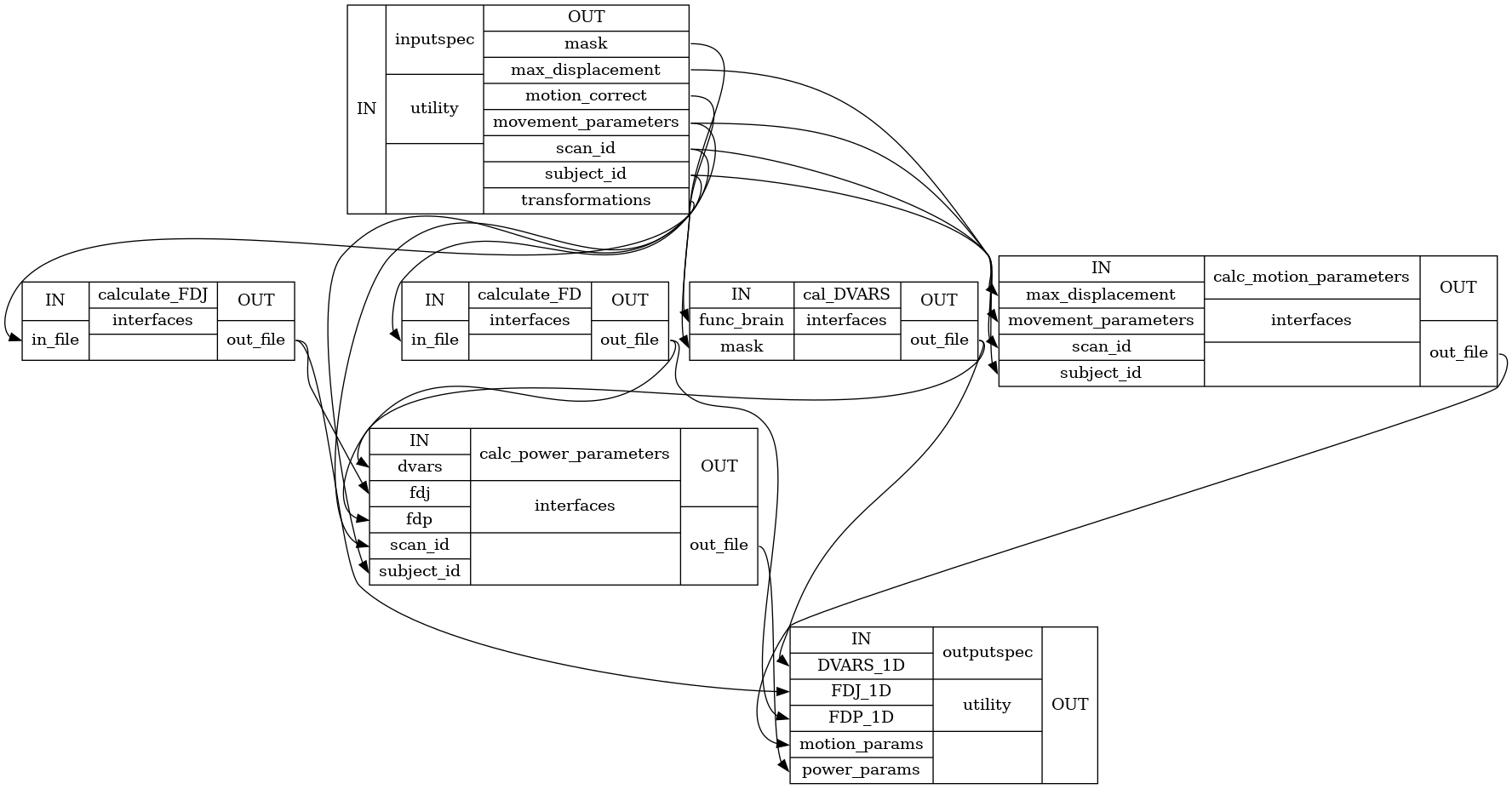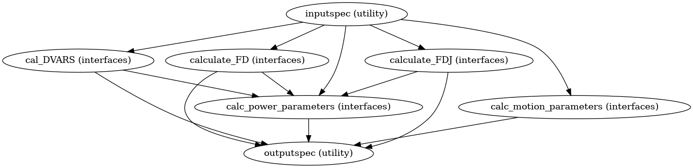 outputspec.FDP_1D : 1D file mean Framewise Displacement (FD) outputspec.power_params : txt file Text file containing various power parameters for scrubbing outputspec.motion_params : txt file Text file containing various movement parameters