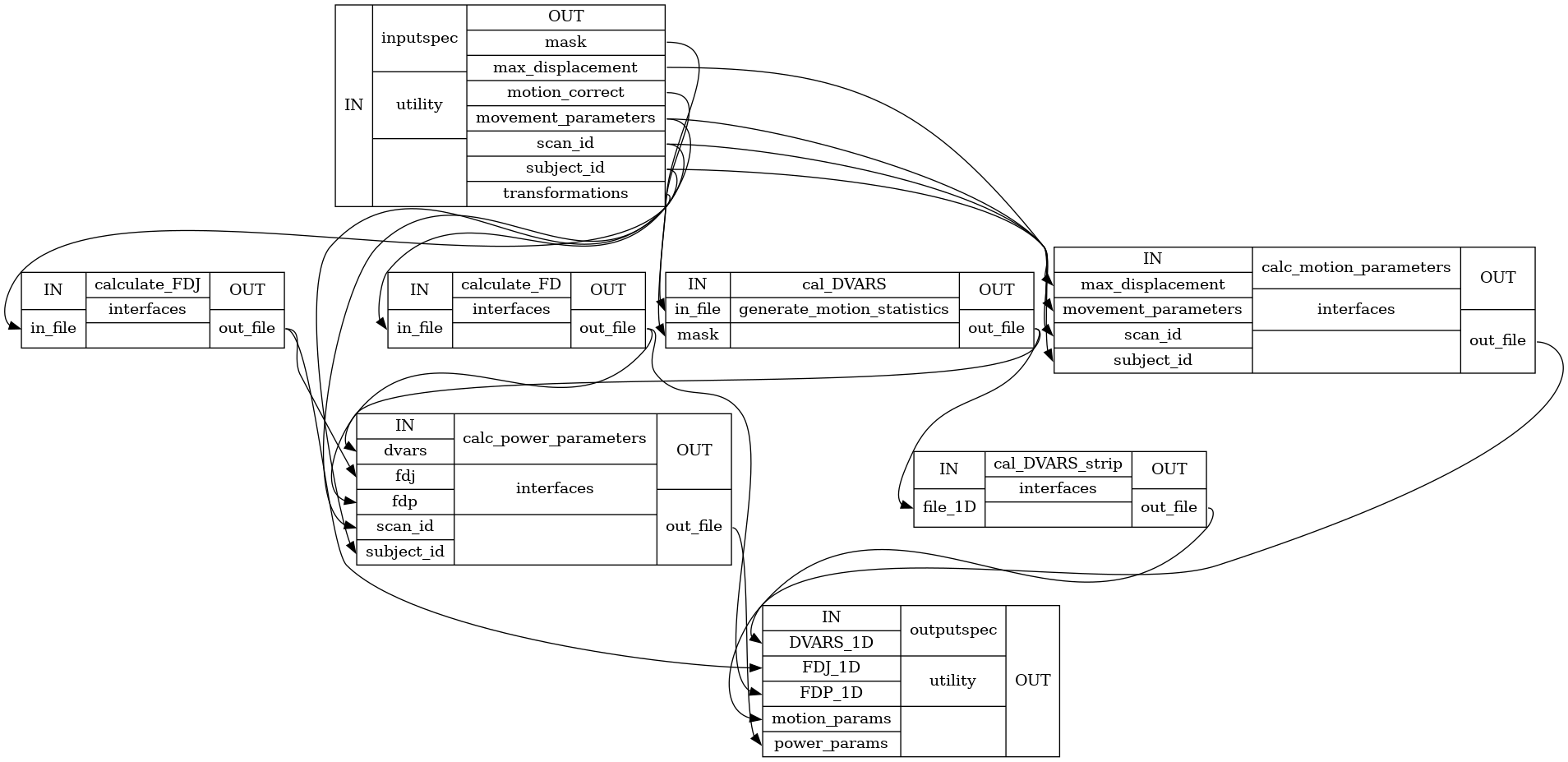 outputspec.FDP_1D : 1D file mean Framewise Displacement (FD) outputspec.power_params : txt file Text file containing various power parameters for scrubbing outputspec.motion_params : txt file Text file containing various movement parameters